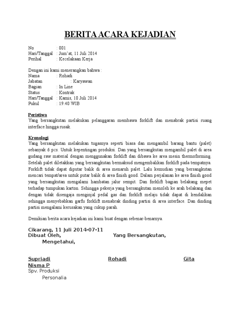 Berita Acara Kejadian Kecelakaan - Surat bisnisnovember 08 ... from untidar.ac.id Berita acara kejadian merupakan sebuah catatan yang berisi kronologi kejadian tertentu dan biasa digunakan sebagai berita acara sebuah tindak kriminal seperti peristiwa kecelakaan, peristiwa perampokan, peristiwa pembunuhan, peristiwa pencurian dan masih banyak lagi. Peristiwa ini bisa mencakup peristiwa perampokan, pembunuhan, kecelakaan, kehilangan, dan masih banyak lagi. Berita acara kecelakaan kerja mp3 & mp4. Surat kronologis kejadian adalah sebuah laporan yang berisi urutan atau catatan peristiwa tentang suatu kejadian dalam waktu tertentu yang diceritakan secara urut sesuai dengan waktu terjadinya. Berita acara kejadian sendiri merupakan sebuah berita acara yang di dalamnya terdapat susunan dari kejadian tertentu. Berita acara kejadian merupakan sebuah berita acara yang didalamnya terdapat susunan dari suatu peristiwa atau kejadian tertentu. Berita acara biasanya dibuat pada suatu kegiatan seperti ketika sedang melakukan tanda tangan. Pembuatan berita acara kejadian ini bertujuan untuk dijadikan sebagai bukti legal mengenai berlangsungnya sebuah kejadian tertentu.